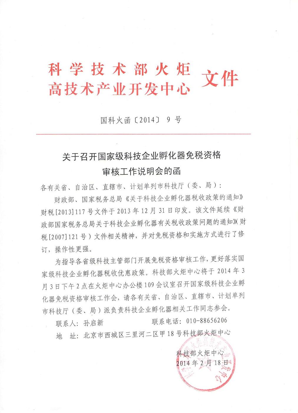 关于召开国家级科技企业孵化器免税资格审核工作说明会的函