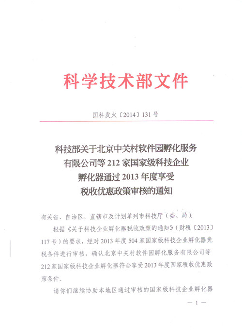 科技部关于北京中关村软件园孵化服务有限公司等212家国家级科技企业孵化器通过2013年度享受税收优惠政策审核的通知