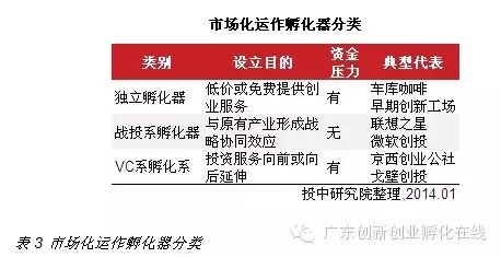 投中研究院根据市场化运作孵化器的最初设立目的和设立主体差异,将市场化孵化器分为独立孵化器、战投系孵化器、VC系孵化器3类: