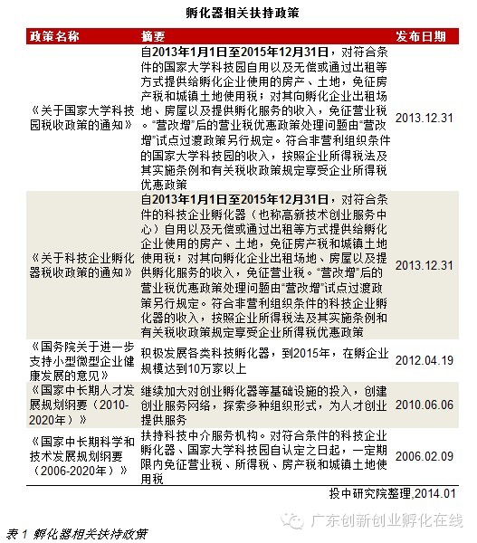 孵化器在国内得以迅速发展,一方面得益于国内创业环境的根本改变,市场化运作的孵化器发展较快,与此同时,国家层面对公益性质孵化器的扶持力度也是不断加强,税收层面的减免直接降低了孵化器的运作成本,对引导国内孵化器不断创新和提高整体孵化能力提供直接动力。