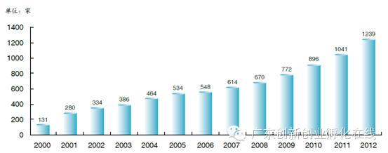 近年来,作为国家创新体系的一个重要组成部分,科技企业孵化器越来越受到全国各地的重视,各类科技企业孵化器的软硬件环境不断改善,服务功能日益增强,孵化器的发展已经迈进了一个新阶段。由下图可知,2000-2012年以来,全国科技企业孵化器的数量平稳增长,根据2012年国家火炬统计手册,全国孵化器数量从131家增长到1239家,2010年至2012年期间更是保持快速增长态势,全国孵化器的发展呈现欣欣向荣之势。