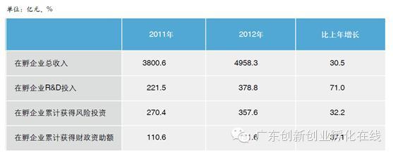 全国科技企业孵化器在孵企业资金投入大幅增长,在孵企业尤其重视对科技研发的投入。如下图所示,2012年在孵企业R&D投入为378.8亿元,相比于2011年增长高达71%,此外,在孵企业累计获得的风险投资、财政资助额也呈快速增长,表明国家对孵化器发展的大力支持, 社会各界对孵化器发展的广泛关注。