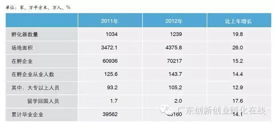 2011-2012年,全国科技企业孵化器的孵化器场地面积、在孵企业数量、在孵企业从业人数以及累计毕业企业数量均呈大幅增长趋势,其中2012年全国孵化器场地达4375.8万平方米,相对于2011年增长了26%。基本情况如下图所示:
