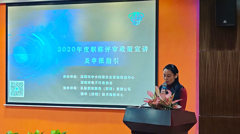 2021年1月6日下午,由深圳市中小科技企业发展促进中心、深圳市电子行业协会共同承办的“2020年度职称评审政策宣讲及申报指引”培训活动在南山区科技园南区成功举办,深圳市国家自主创新示范区服务中心金湛副主任、深圳市中小科技企业发展促进中心张秀萍主任、深圳市电子行业协会赵欣然秘书长等领导和嘉宾出席了本次活动。本次活动通过线下+线上的形式进行,来自深圳市电子、通信等相关专业领域的科技企业代表300余人参加了本次活动。