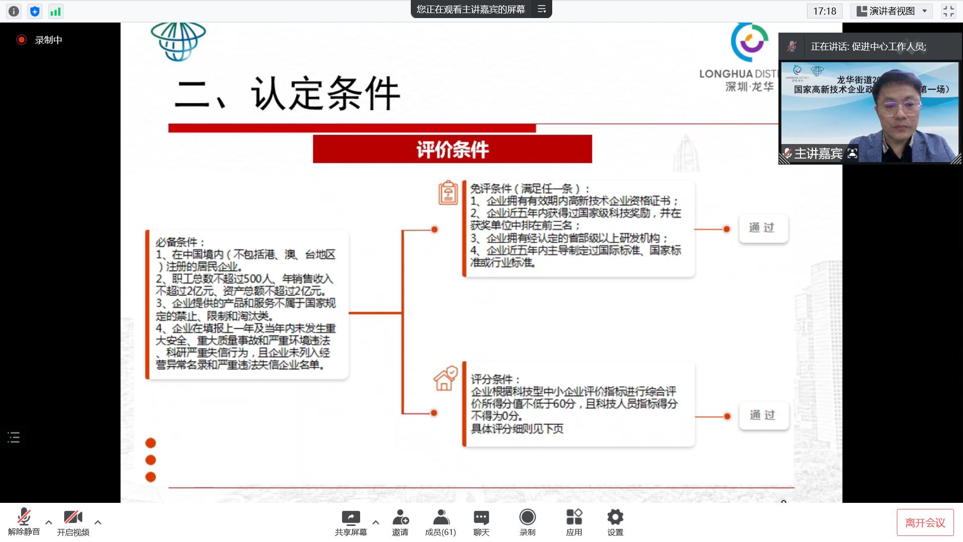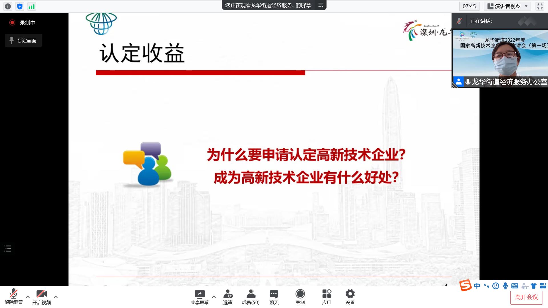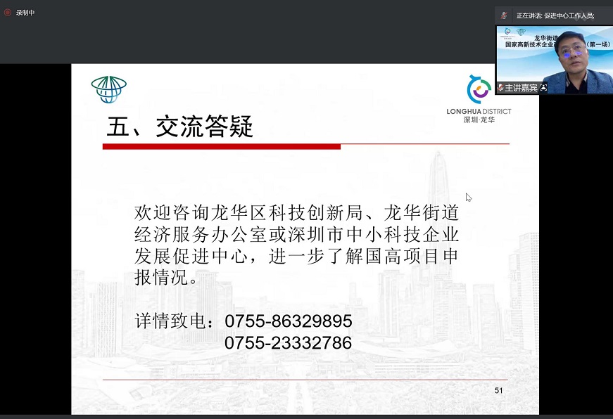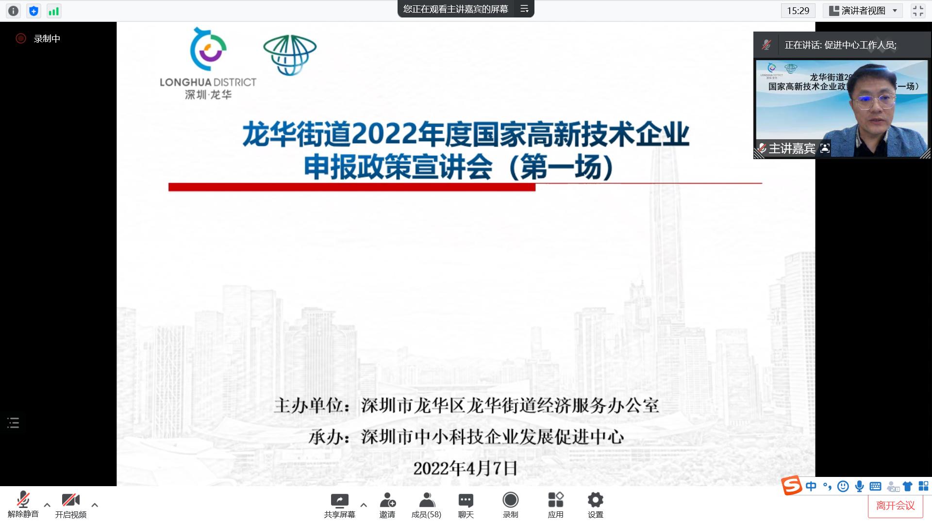 2022年4月7日,由深圳市龙华区龙华街道经济服务办公室主办,深圳市中小科技企业发展促进中心承办的龙华街道2022年度高新技术企业认定政策宣讲会(第一场)圆满举办。