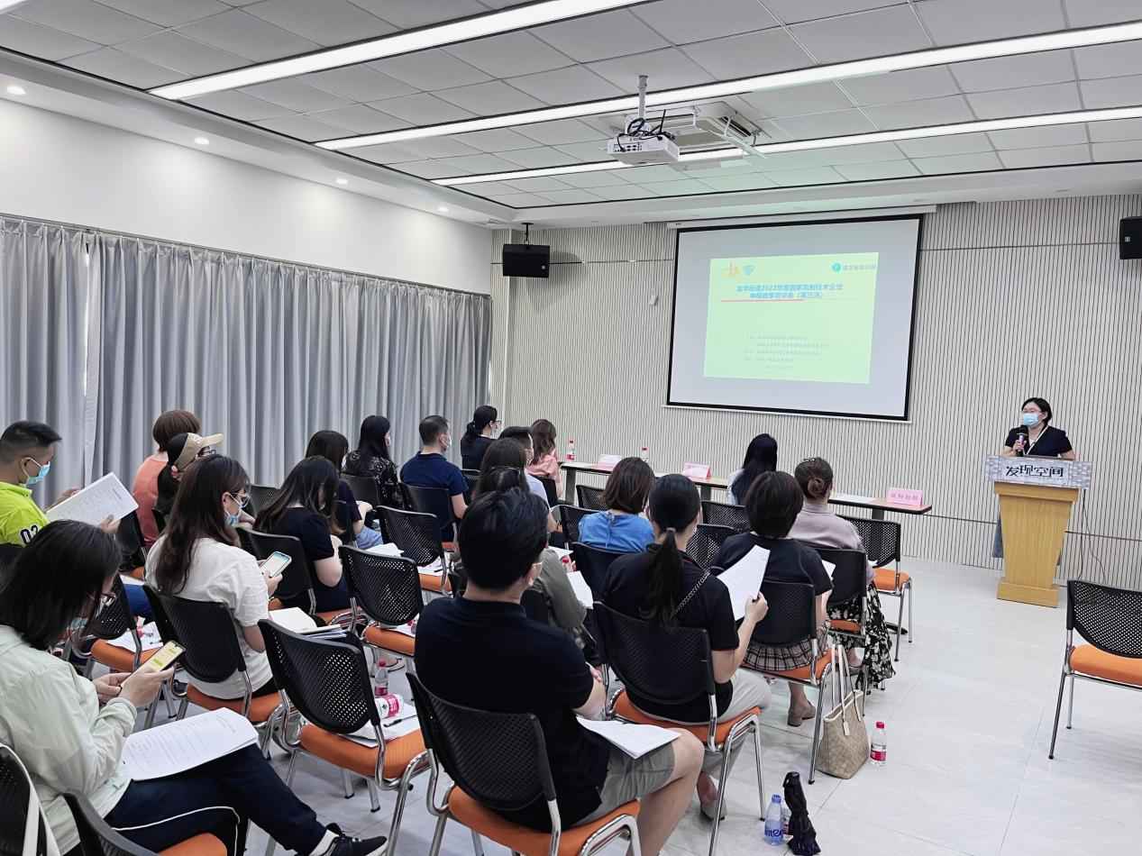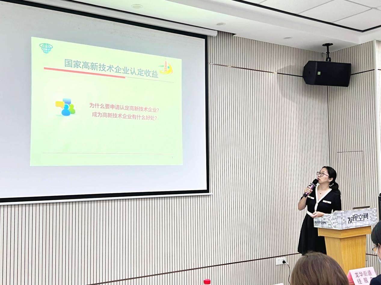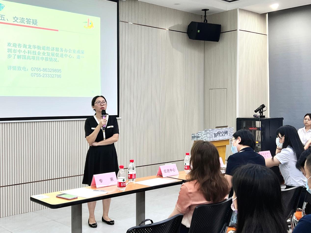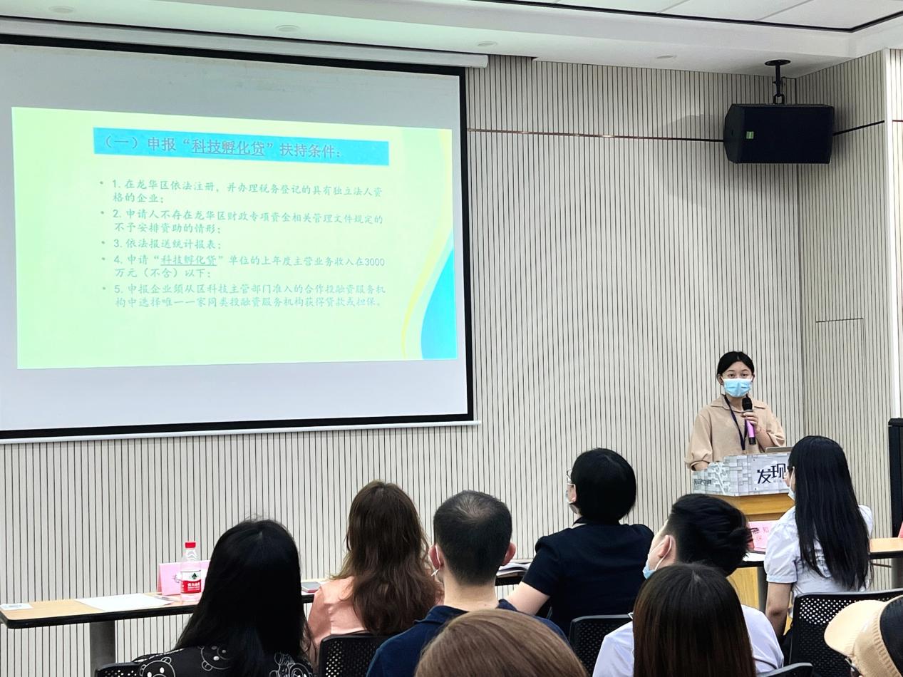 最后,龙华区科技创新局科创中心业务骨干黄小怡同志,从区级科技金融政策对辖区企业可享受的相关惠企政策进行讲解,并鼓励有融资需求的中小科技企业尽早享受到相关科技金融贷款资助。
