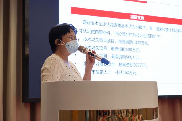 接下来,深圳市中小科技企业发展促进中心顾问专家刘老师针对高新技术企业认定工作流程、材料样式及注意事项、企业研发费用及高新技术产品收入归集与财务管理问题,以及科技型中小企业认定等方面进行了详细讲解。同时,老师围绕知识产权、科技成果转化以及在过去高企申报过程中存在的典型问题进行具体分析。