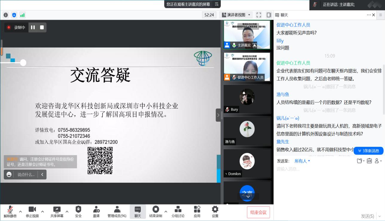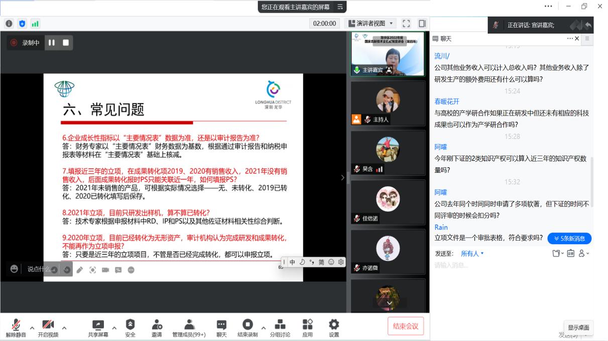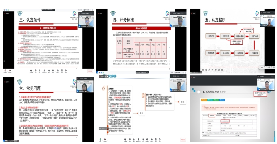 同时,老师围绕知识产权、科技成果转化以及在过去高企申报过程中存在的常见问题进行具体分析。助力辖区企业进一步了解国家高新技术企业认定政策、申报程序、材料准备等环节的注意事项,促进龙华区企业科技转型、提升企业品牌形象、享受税收减免优惠政策、提高企业市场价值和资本价值。