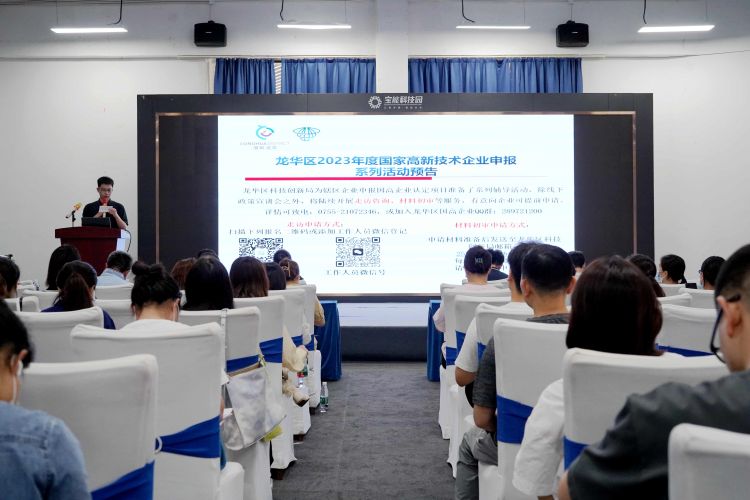 为深入实施创新驱动发展战略、加强创新主体培育、进一步扶持和鼓励高新技术企业在龙华区发展,2023年5月30日,由深圳市龙华区科技创新局主办,深圳市中小科技企业发展促进中心承办的龙华区2023年度国家高新技术企业认定政策宣讲会(第一场)在龙华区宝能科技园阳光厅成功举办。