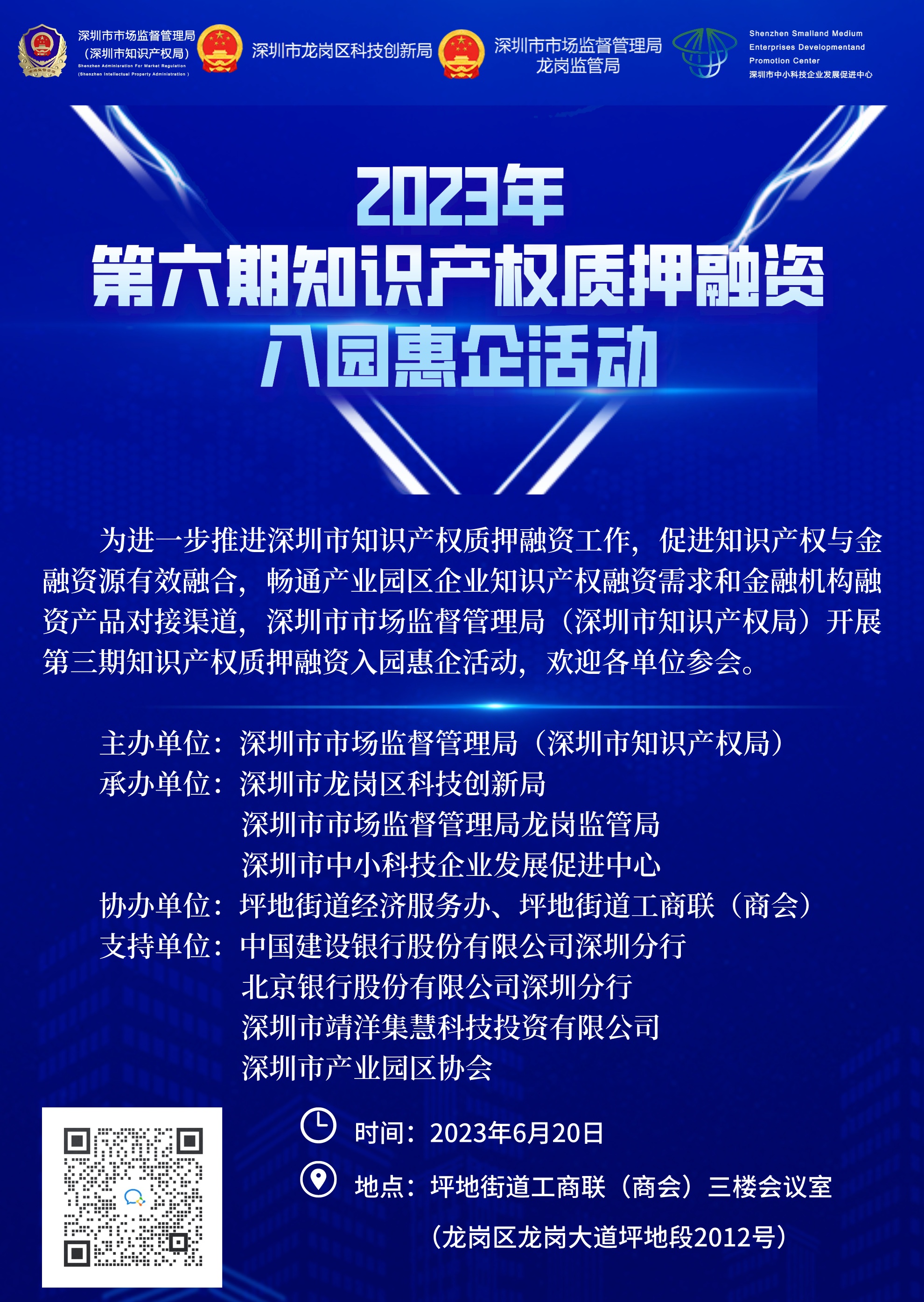 6月20日下午,2023年第六期知识产权质押融资入园惠企活动在坪地街道工商联(商会)成功举办。本活动由深圳市知识产权局主办,深圳市龙岗区科技创新局、深圳市市场监督管理局龙岗监管局、深圳市中小科技企业发展促进中心承办,坪地街道经济服务办、坪地街道工商联(商会)协办,多家金融机构、知识产权机构共同支持举办。旨在推动知识产权质押融资入园惠企,助力畅通产业园区企业知识产权融资需求和金融机构融资产品对接渠道,降低融资成本。30余家市内企业、金融机构和服务机构代表参加了本次活动,各相关领域专家通过活动介绍了知识产权质押融资产品、案例及操作实务。