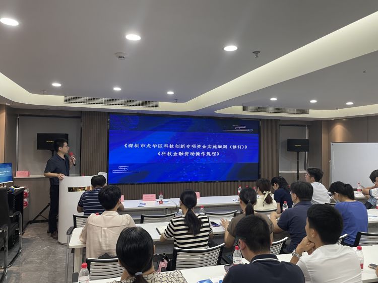 然后,由龙华区科技创新局业务负责人员上台分享了龙华区现有科技金融政策,包括《深圳市龙华区科技创新专项资金实施细则(修订)》及《科技金融资助操作规程》,通过实施科技金融支持计划,解决中小科技企业融资难、融资贵问题,确实有效的降低企业融资成本,助力企业发展。