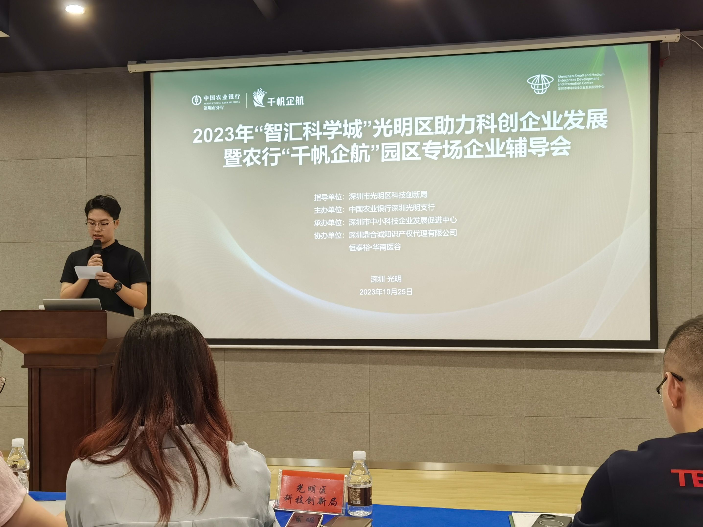 湾有引力,向光而行。2023年10月25日,“智汇科学城”光明区助力科创企业发展暨农行“千帆企航”园区专场企业辅导会在恒泰裕•华南医谷成功举办。此次辅导会在深圳市光明区科技创新局的指导下,由深圳鼎合诚知识产权代理有限公司和恒泰裕•华南医谷联合协办,重点围绕建设光明区“8+5”产业集群,助力光明区企业高质量发展。