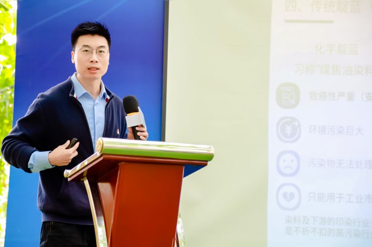 分享会伊始,道生生物联合创始人袁林呈现了他对合成生物技术的专业见解。他分享了利用合成生物技术取代化学合成和植物提取获取靛蓝的知识。袁林聚焦天然色素领域,通过合成生物技术,如同生命之笔一般重新绘制天然色彩乐章的震撼美妙。