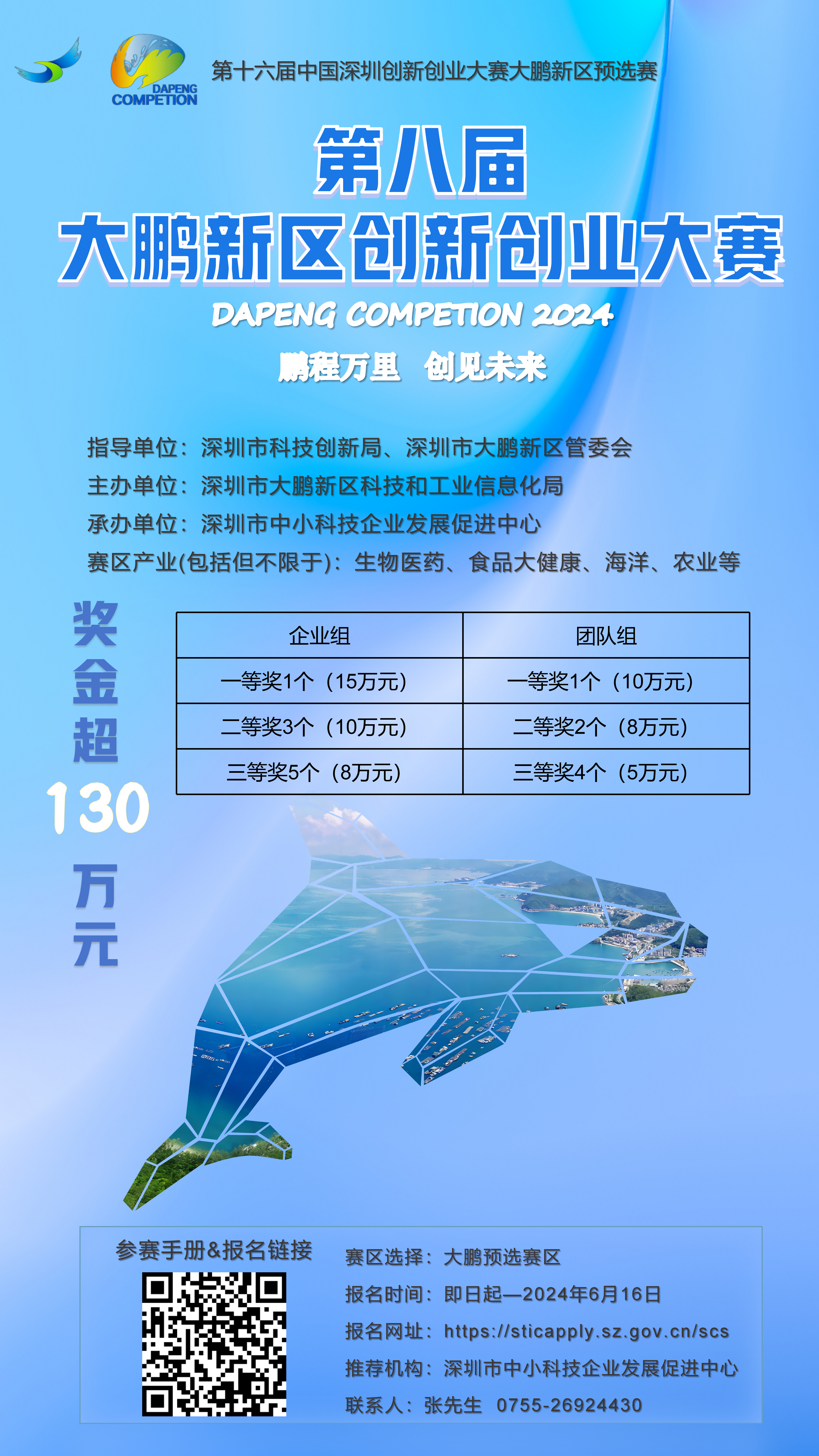 第十三届中国创新创业大赛深圳赛区暨第十六届中国深圳创新创业大赛(简称“深创赛”)是市政府、科技部火炬中心主办的公益性创新创业权威赛事,大赛实施国、市、区三级赛事联动机制,是各区(含深汕特别合作区)、前海管理局、高校举办的各预选赛的晋级通道。第十六届中国深圳创新创业大赛大鹏新区预选赛暨第八届大鹏新区创新创业大赛(以下简称“大鹏新区预选赛”)是新区参赛项目晋升“深创赛”和中国创新创业大赛的唯一通道,是政府主导的公益性创新创业权威赛事。