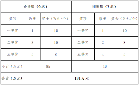大鹏新区预选赛赛区总奖金合计为131万元,共设置一二三等奖16个,其中企业组设一等奖1名、二等奖3名、三等奖5名,奖金分别为15万元(对于未落户大鹏的参赛企业或团队,分为两笔发放,落户前先行发放总奖金的20%,落户后再发放总奖金的80%)。