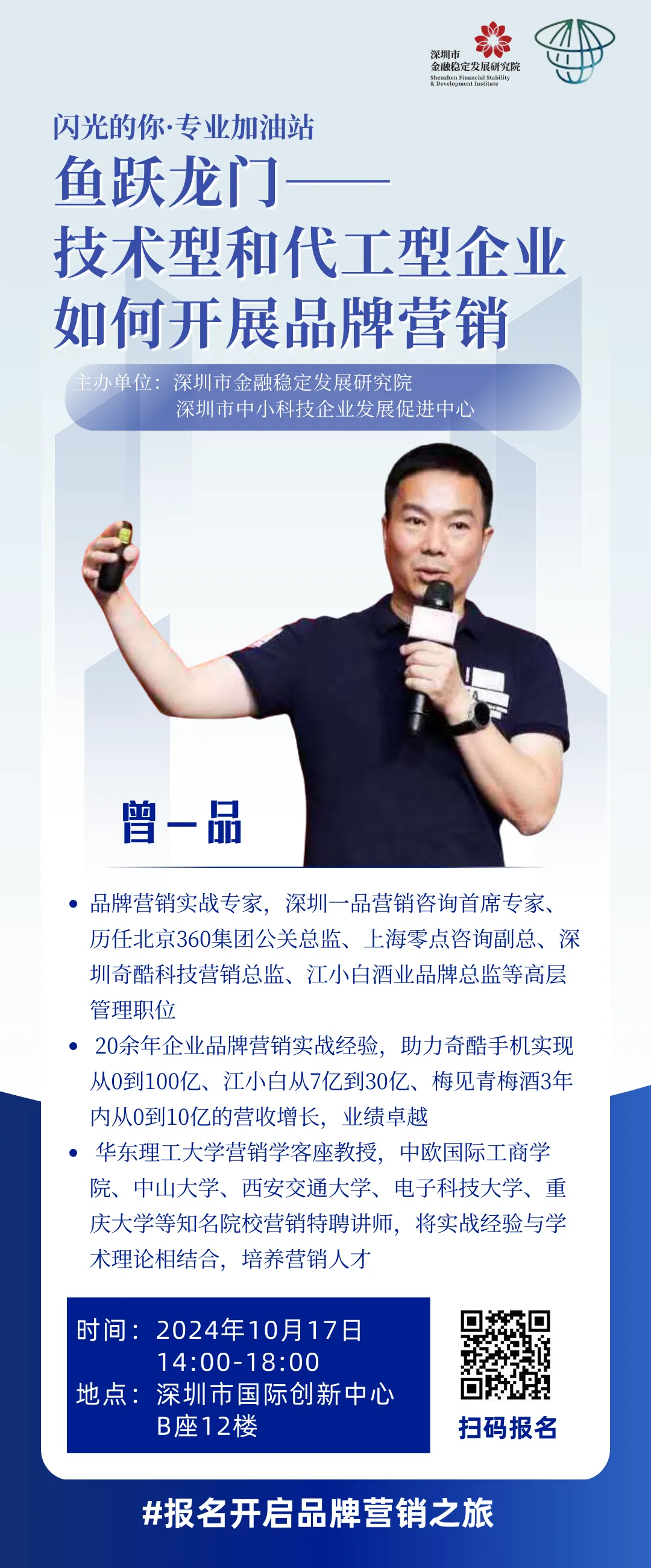为助力企业提升品牌营销能力,金稳院与深圳市中小科技企业发展促进中心联合主办品牌营销专业加油站活动,特此邀请了拥有20年企业营销实战经验的曾一品老师,为大家带来系统性分享,聚焦中小企业如何开展产品设计、市场营销、品牌宣传,助力企业突破增长瓶颈,实现持续增长。