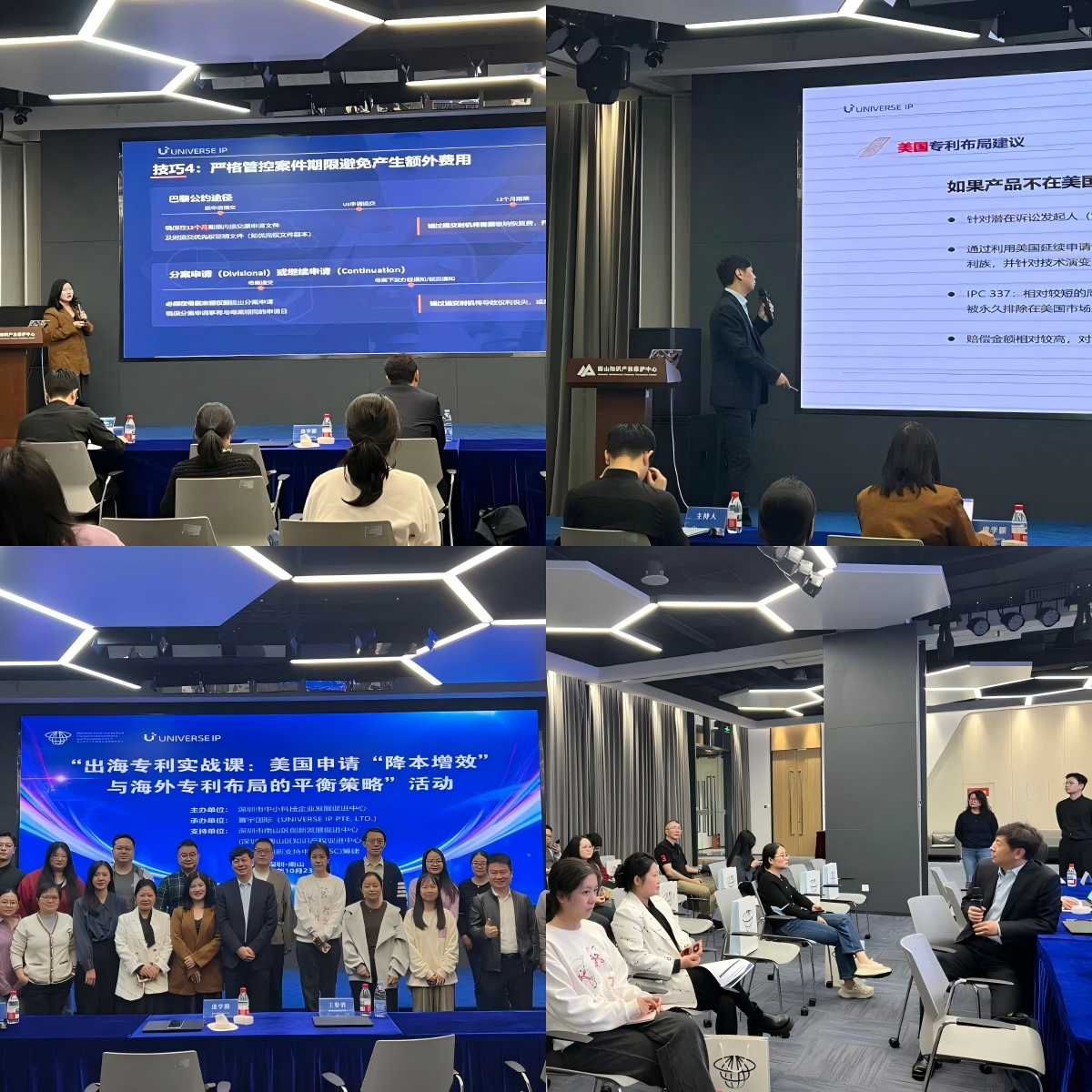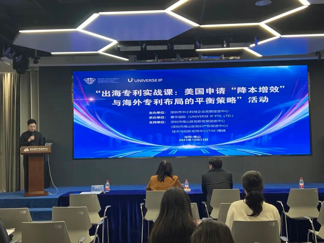 由于美国专利申请体系复杂严谨,其制度与国内实践存在显著差异,导致企业在布局过程中常面临申请策略失当、成本管控失效、审查答复遇阻及潜在侵权风险高等一系列具体挑战,为助力企业针对性的应对上述难题,在2025年10月23日下午,由深圳市中小科技企业发展促进中心主办,寰宇国际(UniverselP Pte,Ltd.)承办,深圳市南山区创新发展促进中心(深圳市南山区知识产权促进中心)技术与创新支持中心(TISC)作为支持单位的“出海专利实战课:美国申请“降本增效”与海外专利布局的平衡策略”涉外专题活动圆满举行。