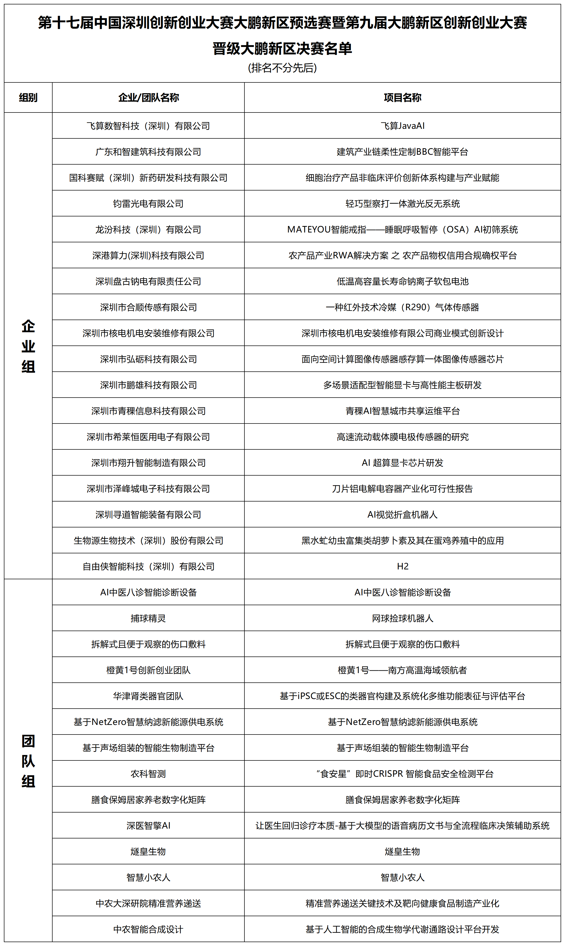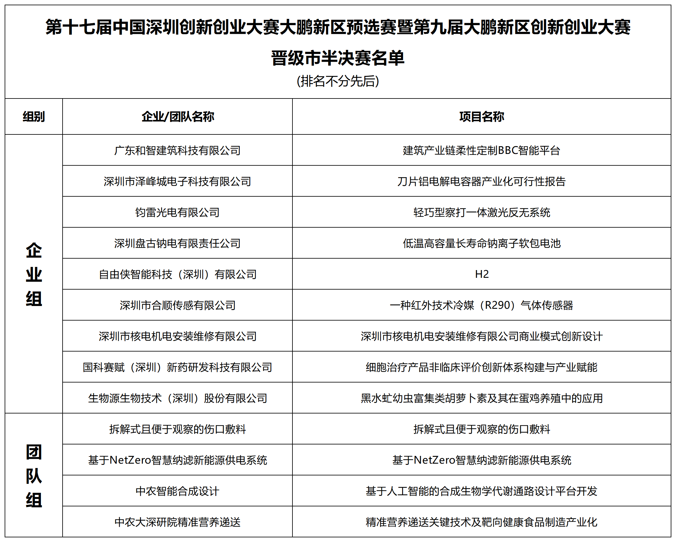 关于公示第十七届中国深圳创新创业大赛大鹏新区预选赛暨第九届大鹏新区创新创业大赛晋级市半决赛、大鹏新区决赛名单的通知。