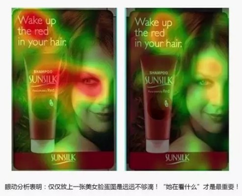 眼球追踪这个技术在用户研究和广告分析领域也是比较常用的,如何去识别一幅广告用户的兴趣区域,用户的浏览轨迹。这是一个很经典的案例,左边这幅广告图和右边的广告图,差别就是女主角的眼神,右边的广告图大家所有注意力都集中在模特身上,而没有看到产品。所以经过眼动的分析,我们叫做注视点分析,就能够很精准的知道一个广告如何去修改,或者如何去呈现出更好的效果。
