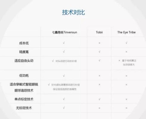 以下是我们和国际比较知名的一家公司的技术对比。Tobii这家公司在眼控技术领域很知名,我们在成本、低功耗、模组体积等方面有明显优势,包括在穿戴式眼控方案领域也布局得非常早,我们从2012年开始就在布局VR/AR 眼控技术的研发了。