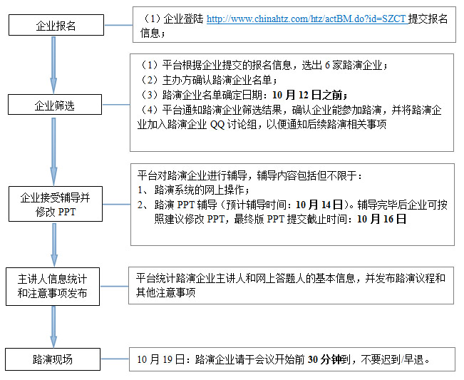1. 报名企业需在10月10日之前,登陆以下网址:http://www.chinahtz.com/htz/actBM.do?id=SZCT提交报名信息。