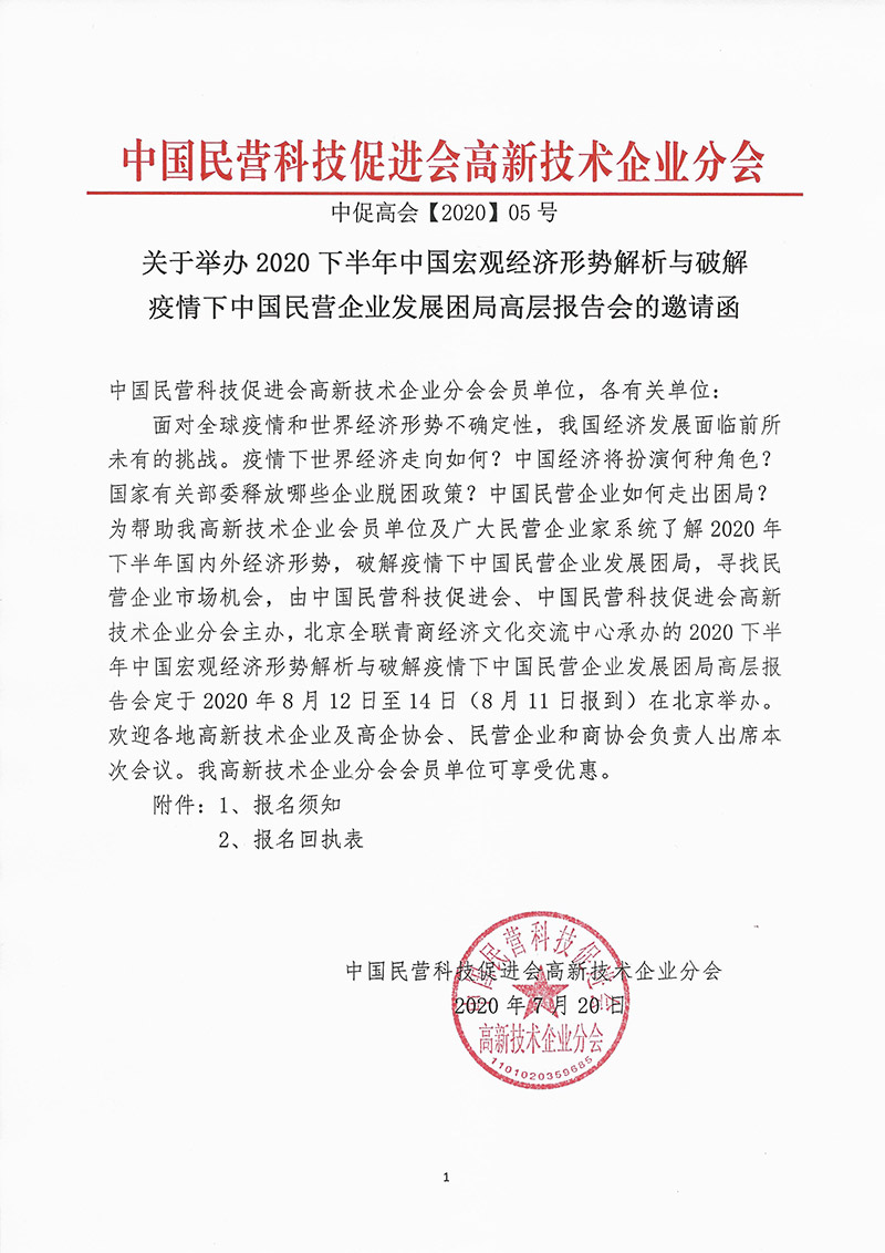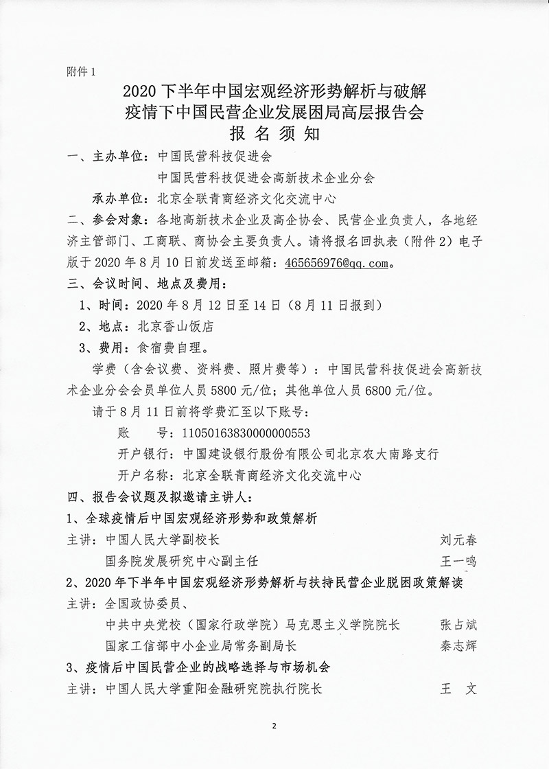 关于举办2020下半年中国宏观经济形势解析与破解疫情下中国民营企业发展困局高层报告会的邀请函