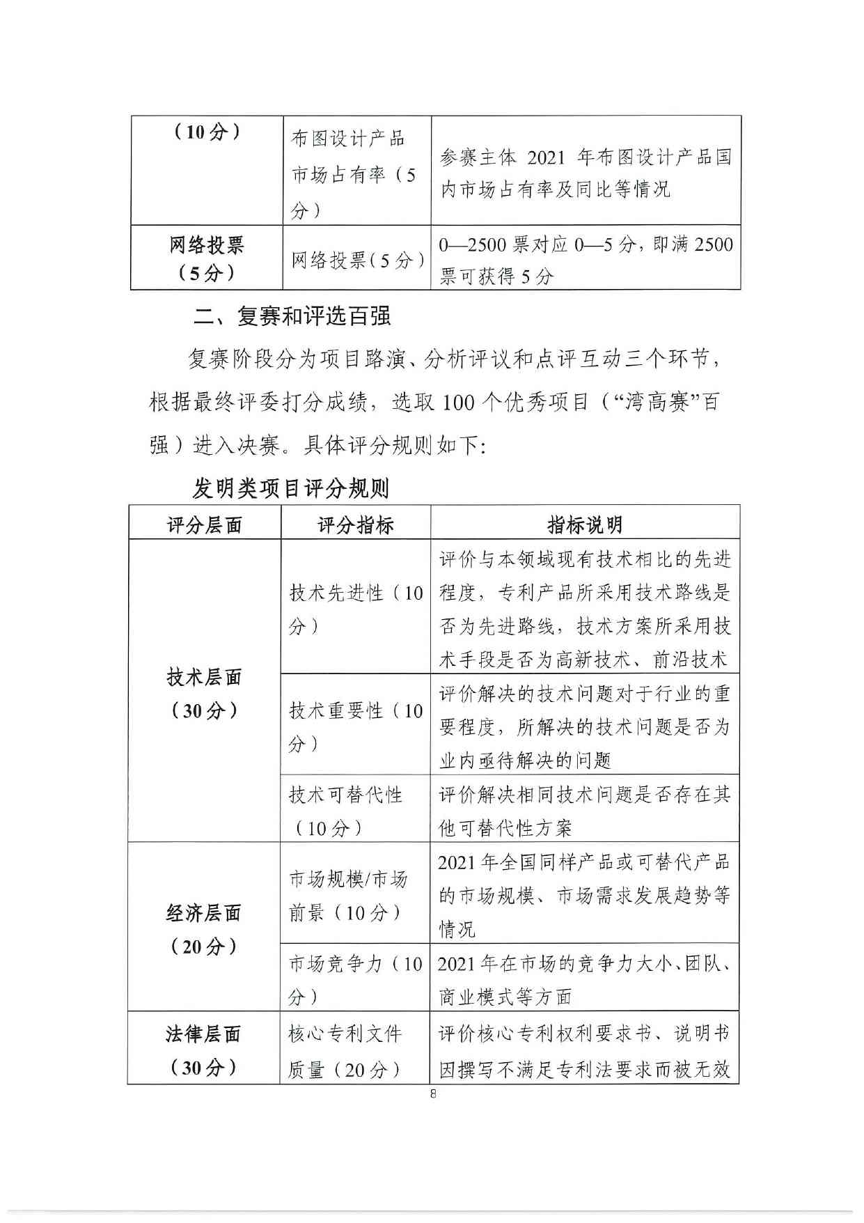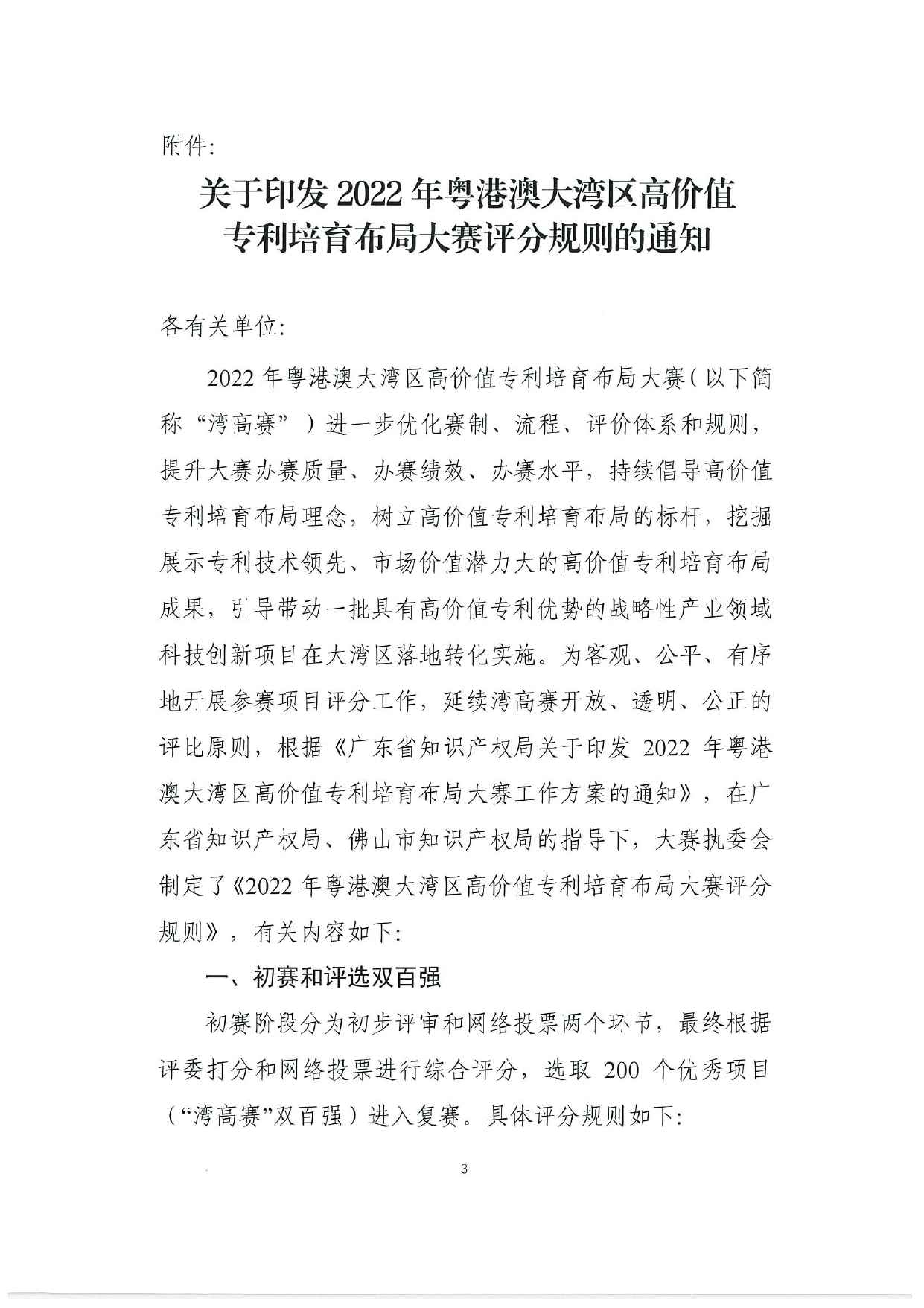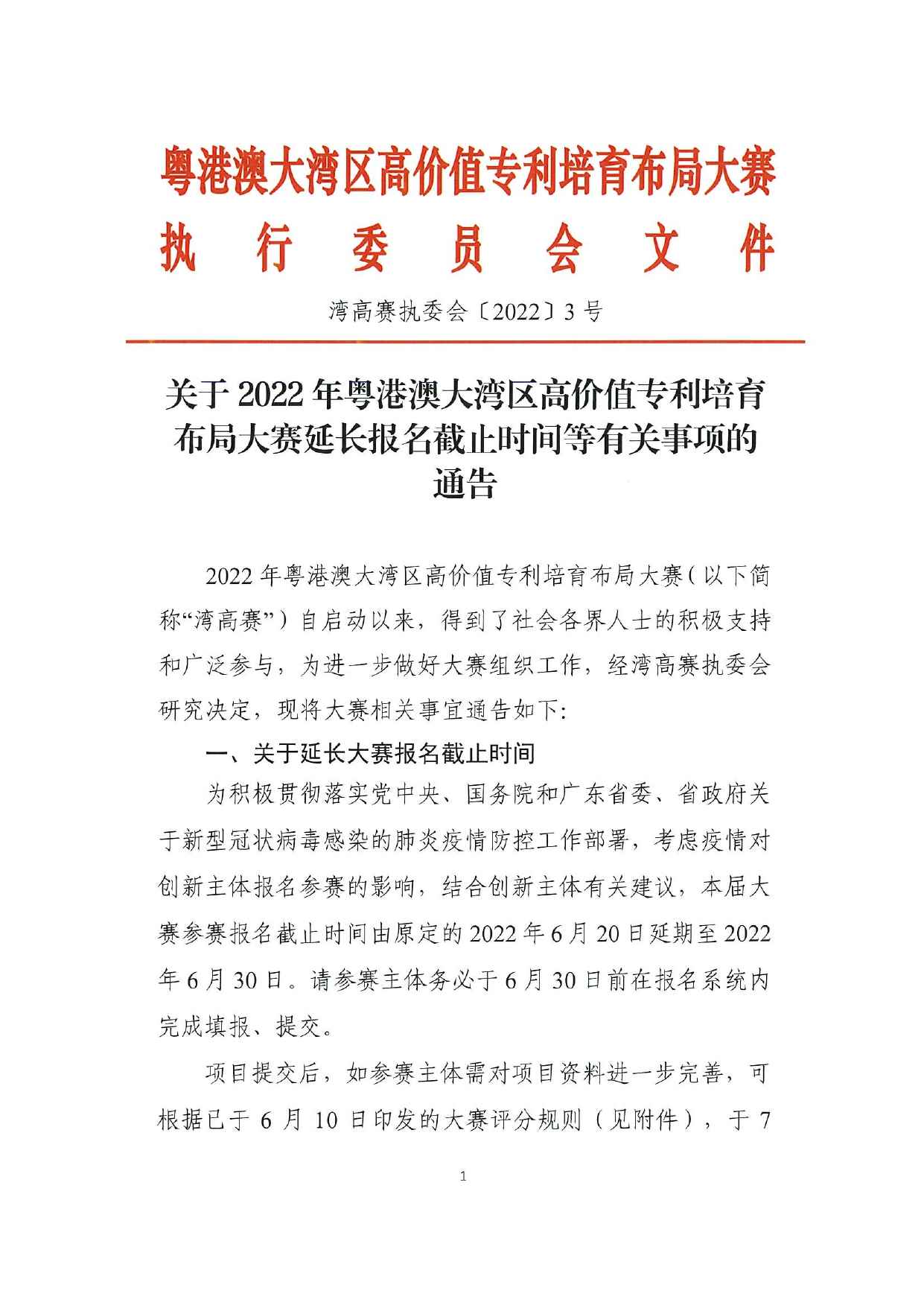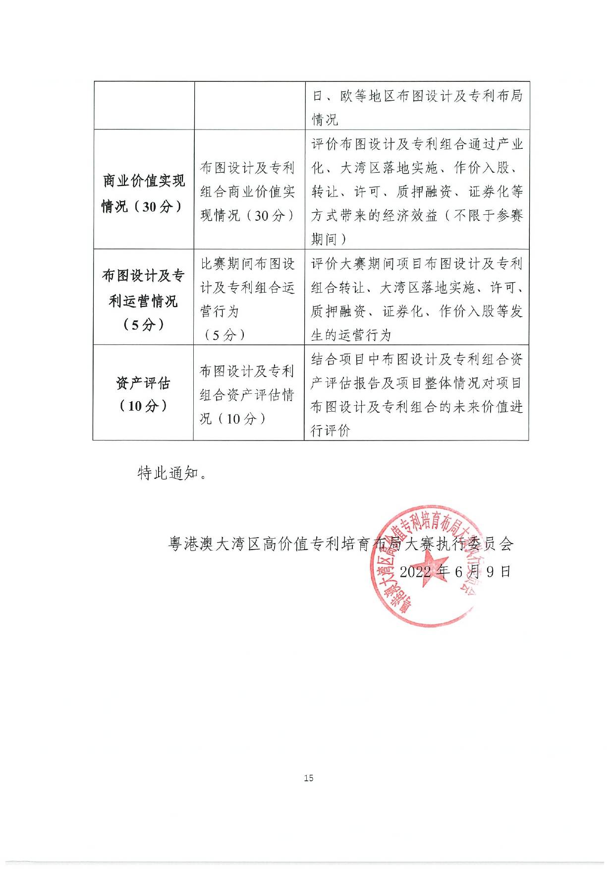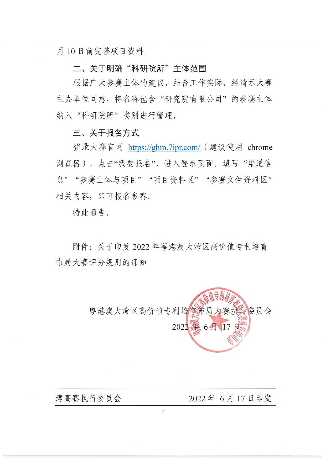 2022年粤港澳大湾区高价值专利培育布局大赛(以下简称“湾高赛”)自启动以来,得到了社会各界人士的积极支持和广泛参与,为进一步做好大赛组织工作,经湾高赛执委会研究决定,现将大赛相关事宜通告如下: